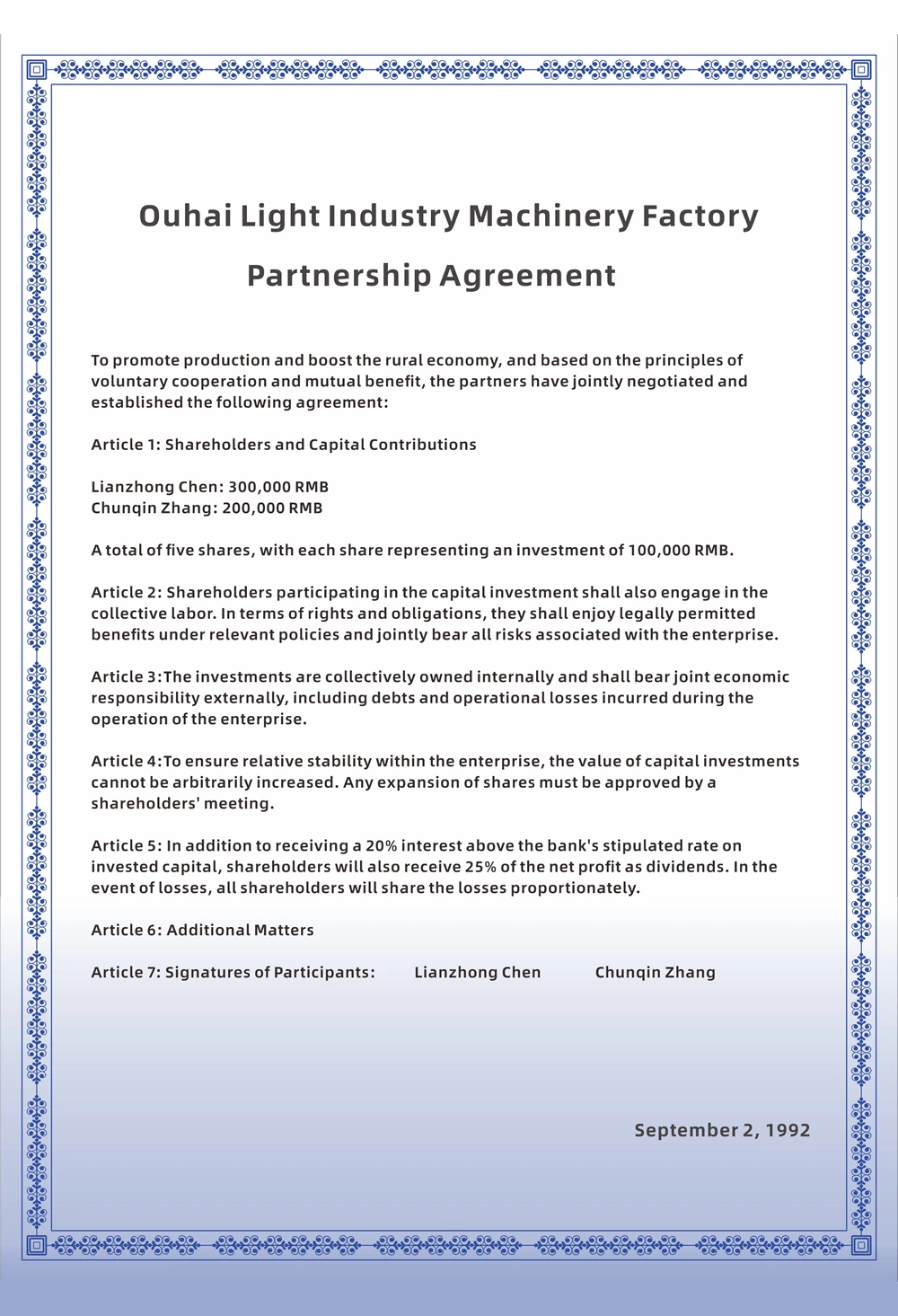 1992年,陈连忠先生与夫人张春琴女士创办了瓯海轻工机械厂,后更名为浙江CL无纺机械有限公司。